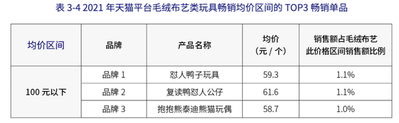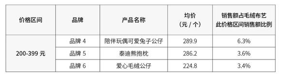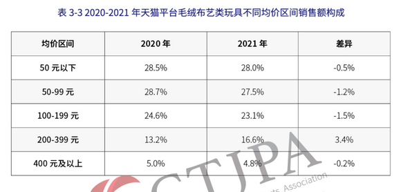 白皮书提到,100元以下的价格区间中,畅销毛绒布艺玩具以网红类产品和人机互动类产品为主;200-399元区间的畅销产品则以国际品牌和IP授权形象的产品为主。