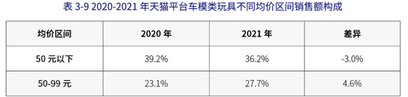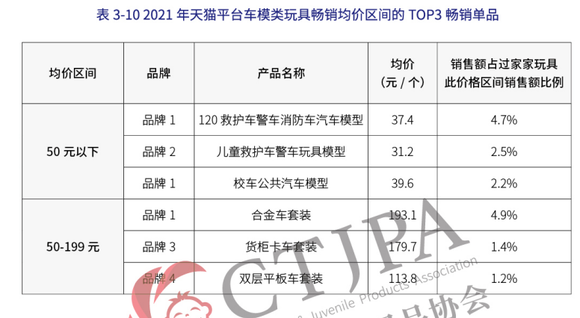 白皮书指出,50元以下价位的车模玩具,畅销产品以警车和跑车类型的合金车为主;50-199元价位,畅销产品以套装类合金车为主。