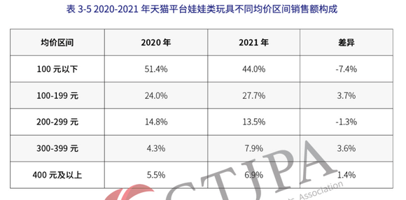 2021年,娃娃类玩具销售额同比下降6.5%,销量同比下降14.7%,销售均价同比增长9.5%。