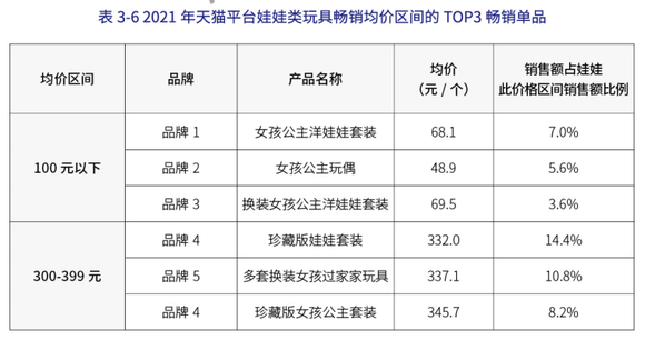 白皮书指出,100元以下价格区间,畅销产品以国产品牌洋娃娃套装为主;300-399元价格区间,畅销产品以珍藏版娃娃套装和增加互动性的过家家类娃娃套装产品为主。