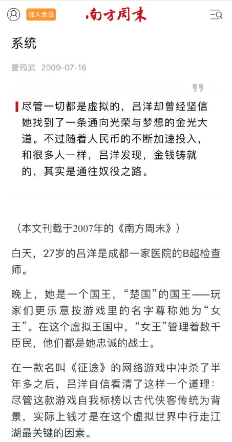 随着2006年《征途》上线将网游从时间付费转向道具付费,玩家群体迅速扩大,游戏体验则变得与以往大为不同。在道具付费模式下,游戏的公平性不再有保障,免费玩家只有被氪金付费玩家按在地上摩擦的份。2007年《南方周末》那一篇关于《征途》的特稿更是让“系统”这个概念第一次破出了圈。