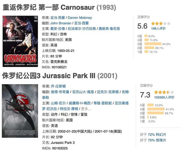 此类很难记住名字的影片也有不少:《被时间遗忘的土地》(2009)、《恐龙侵袭》(2013)、《三叠纪世界》(2018)……它们的豆瓣评分都在3分-4分之间。