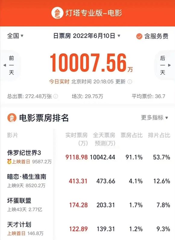 6月10日,《侏罗纪世界3》在北美与中国大陆同步上映,中国电影市场时隔103天再次迎来单日票房破亿。