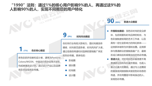 不同行业会依照不同标准对圈层进行划分。在色彩美学的传播领域,我们主要按照对色彩资源的控制力来划分圈层。其中,1%的群体集中在色彩核心圈层中负责开创和引领色彩的潮流,通过在核心圈层的扩散到达9%的时尚风向圈层,再由他们将色彩传播到90%的粉丝圈层和大众圈层。