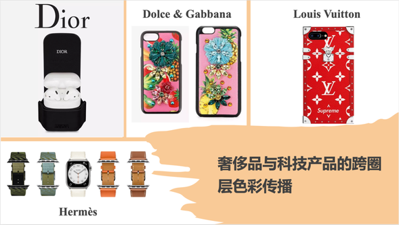 a. 奢侈品与科技产品的跨圈层色彩传播:许多产品的新色研发都会从时尚最新潮流中取材,比如苹果想要将iPhone以及Apple Watch打造为时尚配饰,便从最新的颜色潮流中发行新颜色的产品。从2015年开始,Apple Watch与爱马仕合作生产低调的暗金色表带,以及iPhone配件手机外壳;与LV、Dolce &Gabbana等品牌合作推出奢华灰色和复古彩色的手机外壳。通过邀请各大时尚品牌设计师打造的精美配件,使得色彩从时尚圈流向高科技产品圈,为苹果打入时尚奢侈品圈层提供了基础,树立起苹果科技奢侈品的形象。