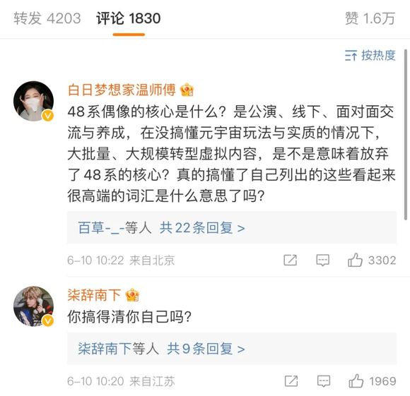 粉丝大山就认为,丝芭传媒这是在放弃48系独有的文化:“48系的核心就是可以面对面的养成偶像,这样做真的很像在为了圈钱而圈钱。”而在丝芭传媒宣布转型的微博底下,也同样有粉丝留言:“48系偶像的核心是什么?是公演、线下、面对面交流与养成系,在没搞懂元宇宙玩法、实质的情况下,大批量、大规模转型虚拟内容,是不是意味着放弃了48系的核心。”这条评论也被粉丝群体赞上了第一位。