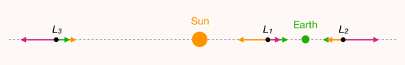 然而,卫星还受到离心力(人坐在旋转木马上感受到的“往外甩”的力,就是离心力)的作用,与地球和太阳的万有引力叠加。但尽管如此,仍然能在太阳-地球连线上为卫星找到一个点,让三个力的作用恰好抵消,见下图: