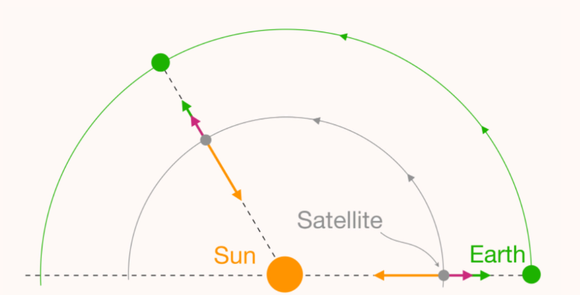 橙色圆形为太阳。绿色圆弧为地球绕太阳公转的轨道;灰色圆弧是卫星绕太阳公转的轨道。太阳和地球的引力分别以橙色箭头、绿色箭头表示。卫星受到的离心力以紫色箭头表示。