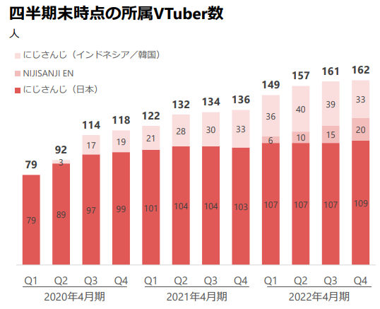 彩虹社旗下的虚拟主播,已经增加至162个,其中日语Vtuber有109个、英语圈20个。2022财年第四季度(今年2-4月)的“彩虹社EN”销售收入超过8亿日元,上一季度是2.25亿日元。