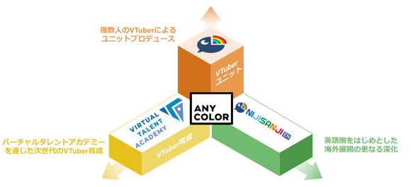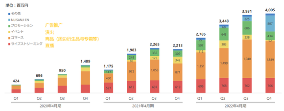 ANYCOLOR的业务分为直播、演出、广告宣传、内容商品销售、英语圈还有其他(主要是海外)等六大部分。