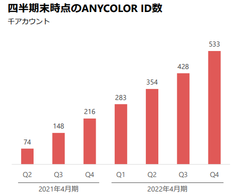 内容商品销售方面,2022财年收入66.39亿日元,ANYCOLOR开设有彩虹社官方线上商城,有专辑、录音等数字商品销售。截至4月末,彩虹社的官方商店和粉丝俱乐部用户ID数达53万。