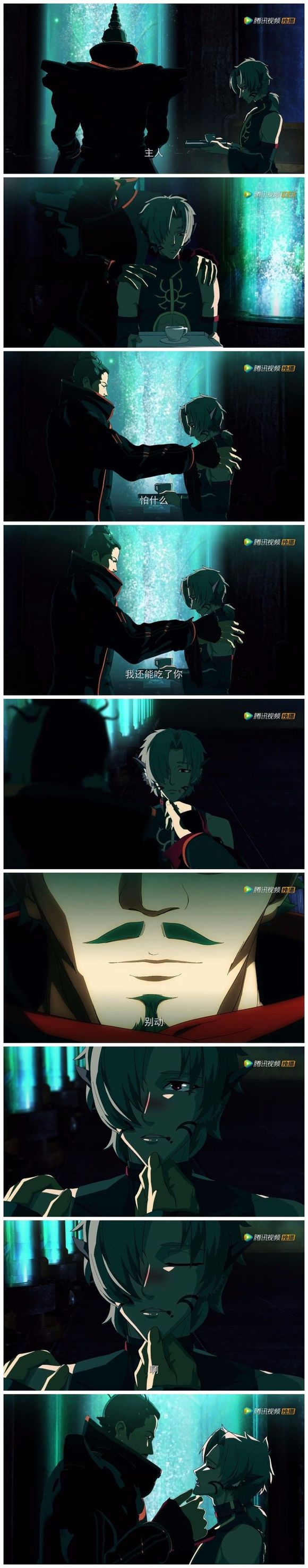 机智的我果断跳过ED和第二集的OP,直接空降到一个看起来就很阴暗99.9%是反派阵营的屋子里,一个身材魁梧、头顶葫芦串的的男人和一个纤细的少年在对话↓