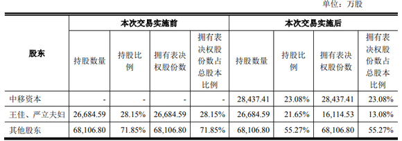 上述事项实施完成后,王佳、严立夫妇合计持有上市公司共计13.08%的表决权,中移资本则持有上市公司23.08%的表决权,上市公司实际控制人由王佳、严立夫妇变更为中国移动集团。