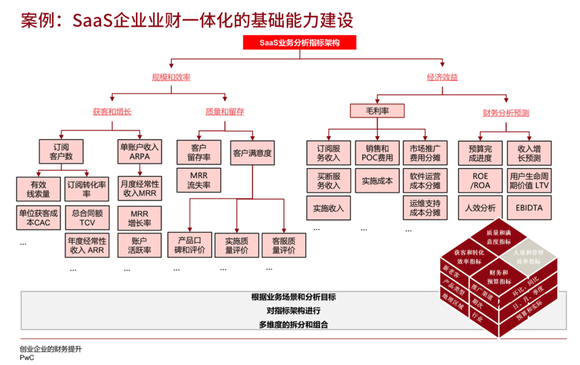 对于一些偏成熟期的企业,选取“业财一体化”的指标时,就需要兼顾不同的视角来构建体系。CEO视角,关心的可能是业务增长率、客户增长率,行业占有率、企业估值这些;CFO的视角,关注的可能是净利润增长,资金运营效率,各项预算等等。整体要找到能兼顾业务发展、财务收益、风险的平衡点。