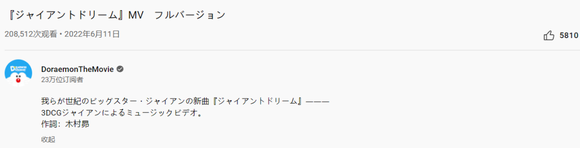 所以,这次官方在YouTube上面放出的《胖虎之梦》MV的视频下面,超过200万次的播放中,点赞的数量还不到6000个,这和其它内容相比来看,似乎点赞的数量少了不少,还好油管在去年底的时候为了创造一个更包容和相互尊重的环境将“踩”的数量隐藏了,要不然又会一条被踩爆的视频。
