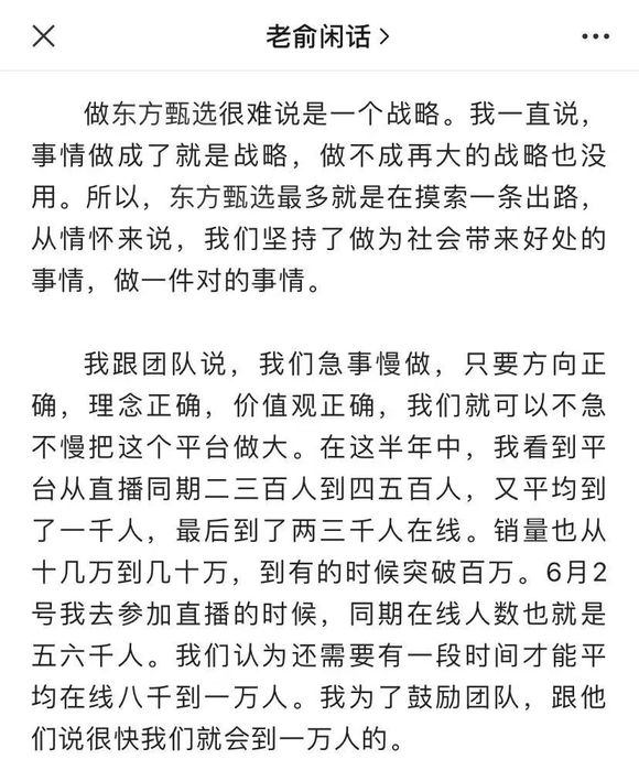 对于突然的爆红,俞敏洪的认识很清醒,6月16日,他在个人微信公众号“老俞闲话”中说,做东方甄选很难说是一个战略。我一直说,事情做成了就是战略,做不成再大的战略也没用。所以,东方甄选最多就是在摸索一条出路。从情怀来说,我们坚持了做为社会带来好处的事情,做一件对的事情。他跟团队说,急事慢做,只要方向正确,理念正确,价值观正确,就可以不急不慢把这个平台做大。
