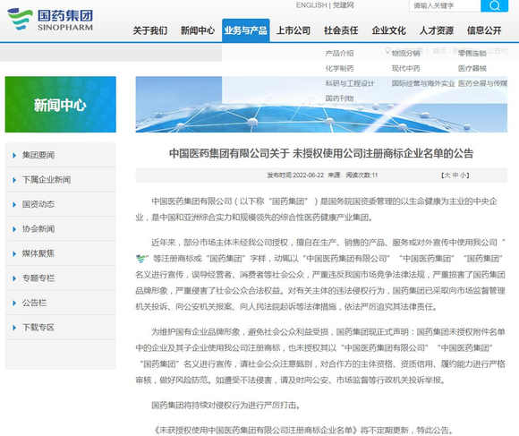 国药集团发布公告称,近年来,部分市场主体未经国药集团授权,擅自在生产、销售的产品、服务或对外宣传中使用公司的注册商标或“国药集团”字样,以“中国医药集团有限公司”“中国医药集团”“国药集团”名义进行宣传,误导经营者、消费者等社会公众,损害了国药集团的品牌形象。