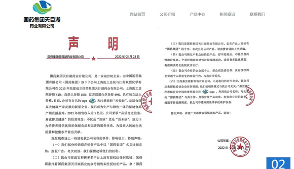 据悉,天目湖公司官网发布了多则声明和公告,其中一则称,“部分公司和个人以国药集团天目湖药业有限公司的名义,在电商平台销售假冒产品。凡单独以‘国药集团’四个字生产、宣称、销售的产品纯属欺诈行为。”此外,天目湖公司还表示,对个别不履行承诺的经销商,公司将采取清理整顿工作。