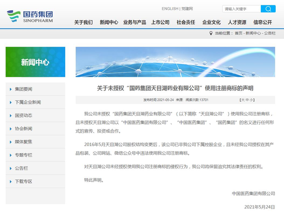 但是,去年5月24日,国药集团官网却发布声明称,“2016年5月天目湖公司股权结构变更后,天目湖已非国药集团下属控股企业。”国药集团还表示,“对天目湖公司未经授权使用公司注册商标的侵权行为,将保留追究其法律责任的权利。”
