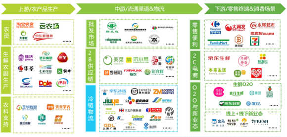 以生鲜为例,通过农产品向品牌产品的转换,上游端从农户变成食品企业,对原料进行严格把控,中游加入分化为线上和线下双渠道共行,降低运输损失,下游端根据不同的消费场景,调配商品,扩大市场范围。