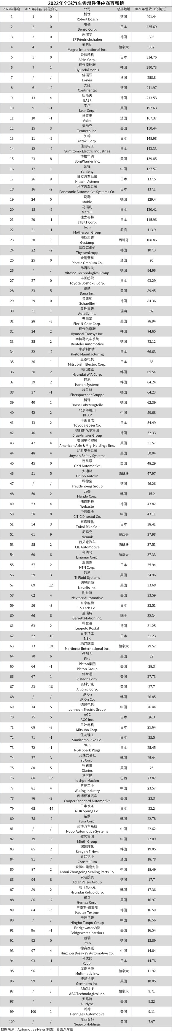 《美国汽车新闻》(Automotive News)发布了2022年全球汽车零部件供应商百强榜,博世、电装、采埃孚、麦格纳国际、爱信精机依旧位居前5,中国今年共计上榜10家企业,较去年多两家,排名最高的依旧是延锋,较去年排名上升1位至17名。