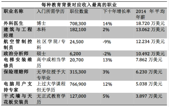通过《职业展望手册》,我们可以看到每种教育背景对应收入最高的职业是什么。