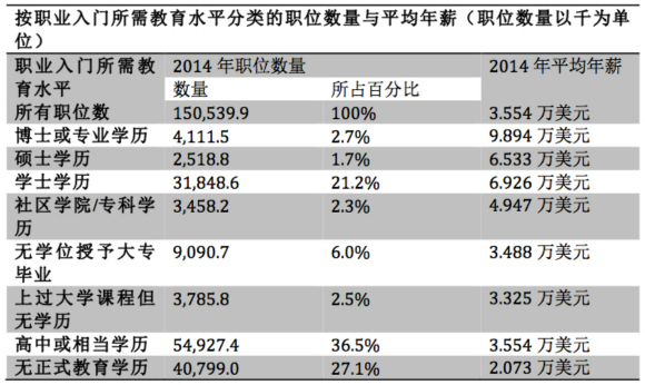 不过有趣的是,以硕士学历为入门条件的职业平均年薪反而比只要求本科学历的职业平均年薪低3930美元,且以本科学历为入门条件的职业数量比前者的数量多得多。