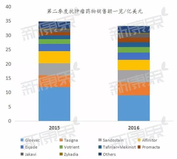 抗肿瘤药物一直是诺华的主打产品,2014年斥资145亿美元收购葛兰素史克肿瘤业务,使其在抗肿瘤药物方面成为仅次于罗氏的全球第二大企业。第二季抗肿瘤药物销售额同比下降了5%,下降的最主要原因是其中的主力军,用于治疗慢性脊髓系白血病(CML)的格列卫Gleevec的专利权已经到期,受到仿制的竞争,此药销售额从2015年第二季的11.84亿美元下降到今年的8.9亿美元。另一个销售额下降比较厉害的是依维莫司片(Afinitor),此药用于治疗乳腺癌、肾细胞癌等,由于其他制药巨头公司推出了竞争产品,销量受到较大影响,不过好消息是最近它又被FDA和欧盟批准治疗包括晚期肺扩散的神经内分泌肿瘤等多种适应症,可以预见销量下跌的情况会得到扭转。