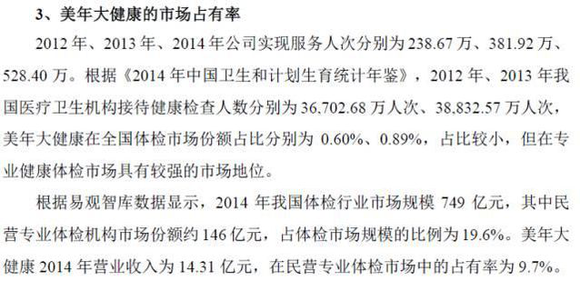 就是否构成垄断,双方各执一词。根据美年健康借壳江苏三友(002044.SZ)上市时发布的《收购报告书》提及,如果以“全国健康检查人数”,包括了公立医疗机构的健康检查人群作为基数,无论是美年健康还是慈铭体检,市场占有率均不到1%。