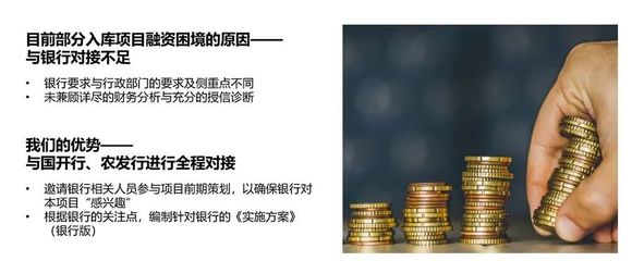 融资成功才是判断EOD项目成功的关键,EOD项目入库后,需要进一步明确银行关注的重点问题,编制《实施方案》(银行版),与银行部门充分对接,获得银行授信和放贷。