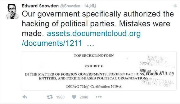 美国中情局前雇员爱德华·斯诺登在自己的推特上表示,美国政府曾批准对国外政党实施网络攻击。同时还附了一份标注“绝密”、日期为2010年7月16日的文件,并列出了涉及的国家、国际组织、国外政治机构。
