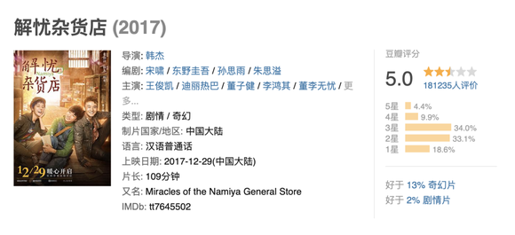 随着IP热潮漂洋过海来到中国的东野圭吾,也在2017年接连受挫。《嫌疑人X的献身》以4亿票房宣告终结后,2017年底,《解忧杂货店》在国内上映。尽管原著自带热度,也有迪丽热巴、王俊凯等明星阵容加持,但票房表现只有2.23亿。与《嫌疑人X的献身》类似,两部电影的口碑都比较一般,《解忧杂货店》的豆瓣评分只有5.0,大多数观众都对改编表达了不满。
