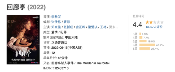 《回廊亭》前几天在豆瓣开出了4.4分,是今年播出的国产剧评分倒数第二名。