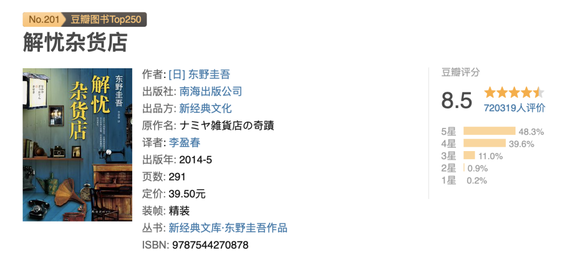 2017年亚马逊中国发布的年度阅读榜单显示,自2014年起,《解忧杂货店》连续4年成为亚马逊(中国)最畅销图书,就此确立了东野圭吾在中国内地头部畅销书作家的地位。