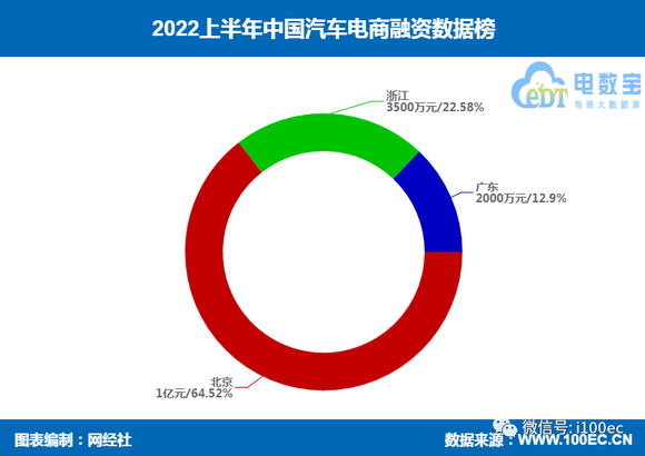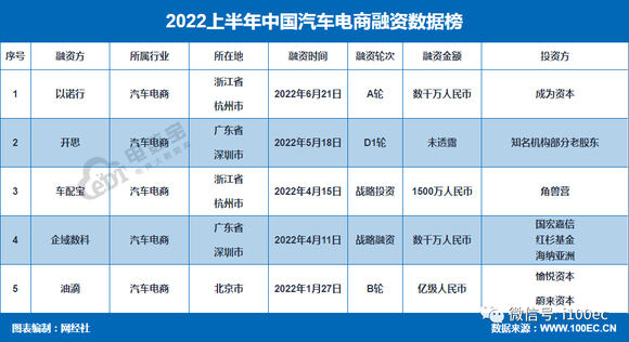 据网经社旗下电商大数据库“电数宝”(DATA.100EC.CN)监测数据显示,2022年上半年汽车电商融资事件数共5起,融资总金额超过1.5亿元。投资方包括:成为资本、角兽营、国宏嘉信、红杉基金、海纳亚洲、愉悦资本、蔚来资本等。