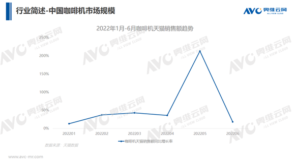 2021年全球咖啡机市场规模已经达到153.4亿美元,预计到2028年将会增长到206.0亿美元,年复合增长率达4.3%。从中国来看,由于中国消费者对生活品质要求越来越高,其对于咖啡的态度也不断发生改变,咖啡在中国消费者中的不断渗透给咖啡机企业带来了新的商机。根据公开数据显示,2022年咖啡机天猫销售额连续增长六个月,同比增长率最高达200%以上,俨然成为“高端新刚需”小家电。