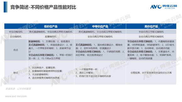 从产品性能角度来看,各价位产品都能满足基本的咖啡需求。咖啡机低价位产品基本上是胶囊咖啡机和美式滴滤咖啡机,这两种咖啡机以方便快捷取胜,但缺点在于,美式滴滤咖啡机只能制作美式咖啡,因而偏好奶咖的消费者不适合使用该种咖啡机。中等价位的产品中部分美式滴滤机结合了滴滤装置和手冲装置,增加了一些可玩性,同时部分半自动咖啡机和全自动咖啡机可以满足家庭咖啡机的需求,而对于商用咖啡机而言中等价位的半自动和全自动咖啡机可以基本满足使用需求,但与高价位产品相比中等价位咖啡机较为不稳定,出品速度也无法完全保证。高价位产品价格较高,性能齐全,可玩性高,对于家庭来说性价比不高,但对于精品咖啡馆来说是不错的选择。
