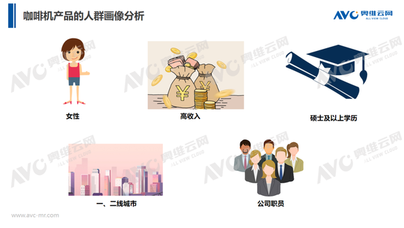 数据显示,咖啡机主要消费人群为高线高收入女性公司职员,年龄主要在25-30岁。这类消费者在工作和社交场合中更容易接触到咖啡,更容易形成对咖啡机的长期需求;同时这类消费者更倾向于追求高生活品质,从平时忙碌的生活中获取精致生活的灵感,而较高的收入也让他们有能力为咖啡机产品花钱。