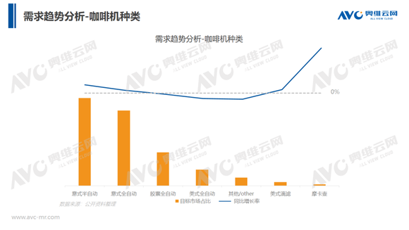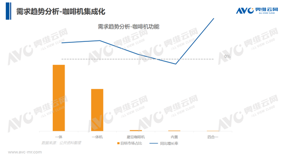 根据研究,目前“一体”咖啡机目标市场占比最高,同时保持着不低的增长率,市场上的一体式种类也在不断增加,呈现上升趋势。