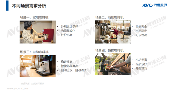 咖啡机的使用场景可以大致分为:家用、商用、自助和便携咖啡机。目前商用咖啡机为主要的需求来源,根据分析,未来其他三种场景下的咖啡机需求也有很大提升空间。