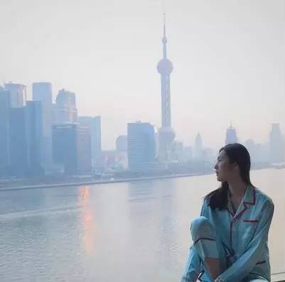 照片里的她身穿水蓝色睡衣望向浦江,