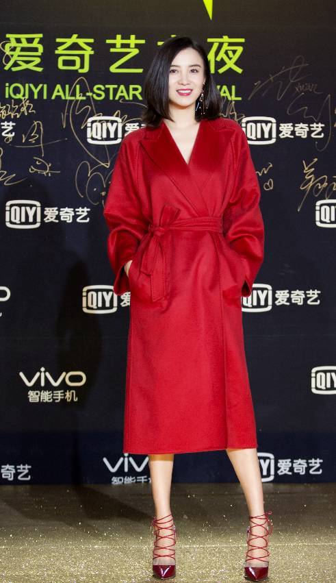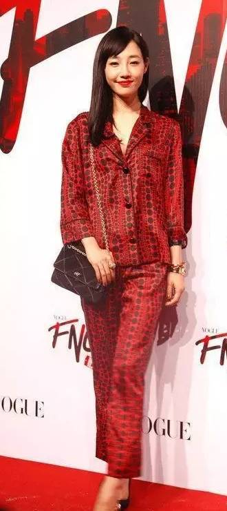 白百合也一袭红色波点“睡衣”套装