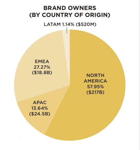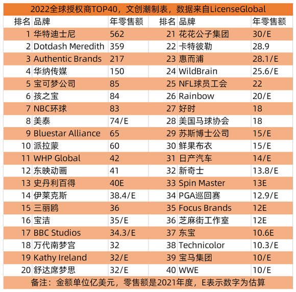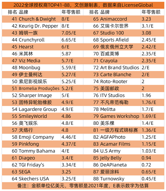 本次榜单列举了88家公司,其中前四十的授权商品2021年销售额均超过10亿美金。