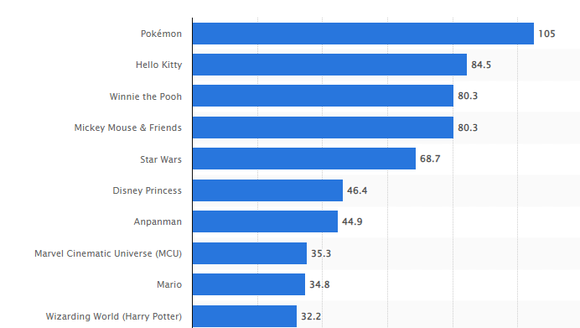 License Global引用Statista的数据,表示2021年度表现最好的媒体内容IP分别为宝可梦、Hello Kitty、维尼熊、米老鼠、星球大战、迪士尼公主、面包超人、漫威宇宙、马里奥、哈利波特、变形金刚、蜘蛛侠、蝙蝠侠、龙珠、使命与召唤、芭比、高达、玩具总动员、汽车总动员和魔戒。