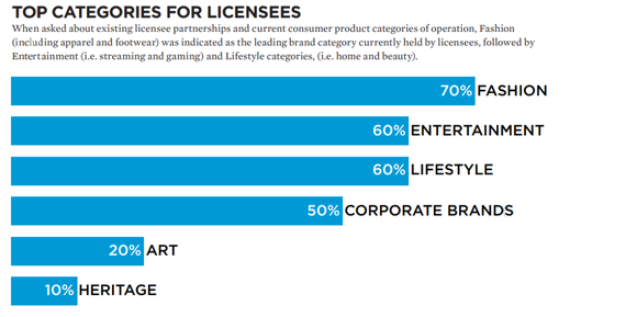 调查显示,被授权商所处领域方面,时尚行业(包括服装鞋履)份额最大,其次是娱乐(包括游戏、流媒体等),再次为生活方式(包括家居和美妆)。