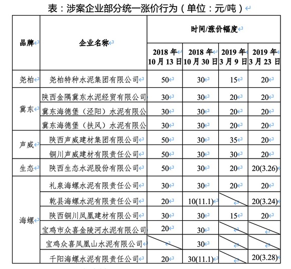 涉事企业包括尧柏特种水泥集团有限公司、陕西金隅冀东水泥经贸有限公司、冀东海德堡(泾阳)水泥有限公司、冀东海德堡(扶风)水泥有限公司、陕西声威建材集团有限公司、铜川声威建材有限责任公司、陕西生态水泥股份有限公司、礼泉海螺水泥有限责任公司、乾县海螺水泥有限责任公司、陕西铜川凤凰建材有限公司、宝鸡市众喜金陵河水泥有限公司、宝鸡众喜凤凰山水泥有限公司和千阳海螺水泥有限责任公司。