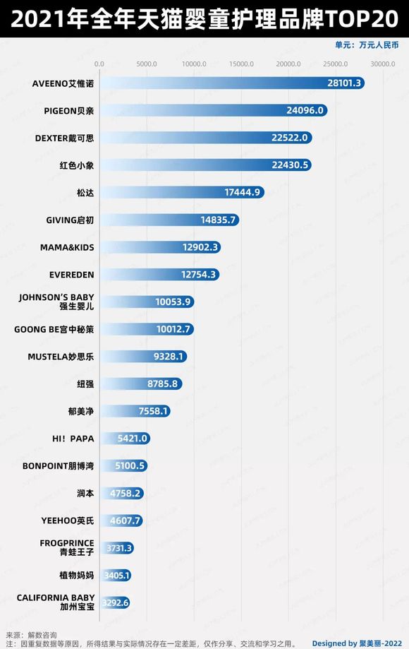 如下图,根据解数咨询数据,2021年全年天猫婴童护理品牌TOP20的名单中,除国际品牌外,也有像戴可思、红色小象、启初、海龟爸爸这样的国货新锐品牌。