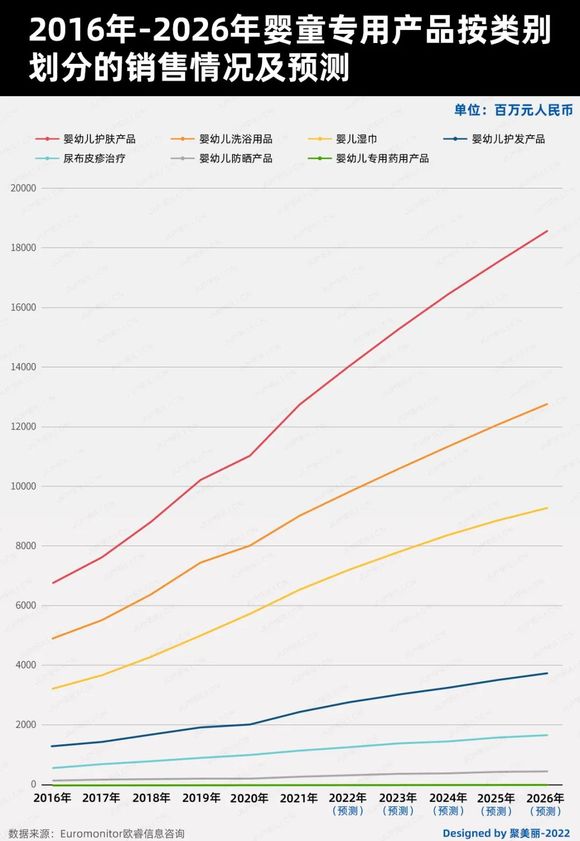 如下图,欧睿咨询数据显示,2016年-2026年这10年间,婴童护肤品一直是婴童品类的增长引擎(包括预测),并在2021年仍是占比最大的类别,销售额达到120亿元。而到2026年,婴童护肤品类的市场规模预计将达到180亿元,同比增长45.6%。