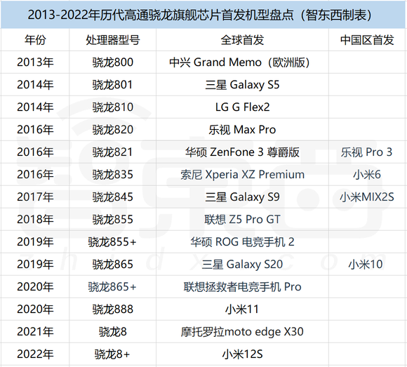 ▲2013-2022年历代高通骁龙旗舰芯片首发机型盘点,根据公开信息整理