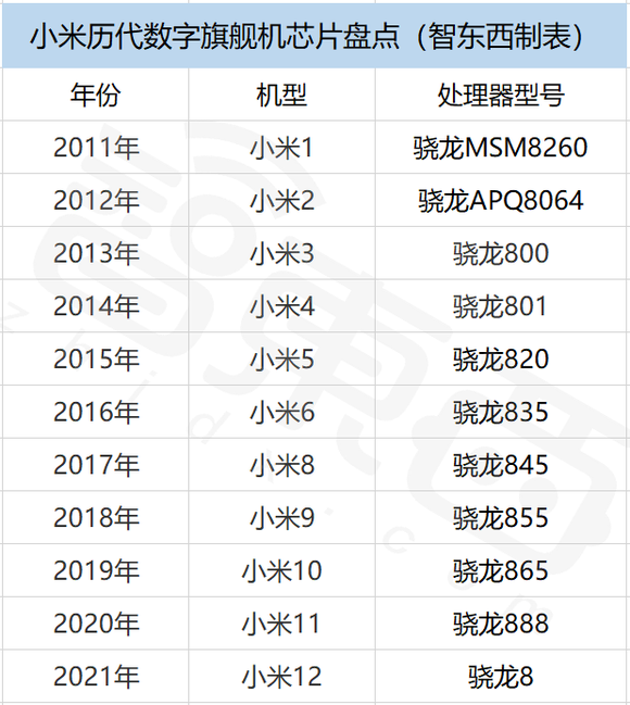 ▲小米历代数字系列旗舰机芯片盘点,根据公开信息整理